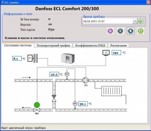 Отметим, что причинами низкого энергосберегающего эффекта от применения системы автоматического регулирования могут быть не только физические дефекты, связанные с элементами входящими в её состав, но также некорректные настройки контроллера или низкая температура теплоносителя, подаваемая теплоисточником в систему отопления объекта. В связи с необходимостью осуществлять обслуживание (техническое и информационное), установленных регуляторов на объектах теплоснабжения, разработано программное обеспечение для удаленного доступа с целью мониторинга функционирования системы и настройки параметров регулирования. В модуле ИАС «Регулятор ECL Comfort» реализованы следующие функции: считывание настроек регулятора и текущих измеренных значений, изменение температурного графика регулирования, задание уставок температур для дневного и ночного режима, установка расписания периодов снижения температурного графика, настройка коэффициентов ПИ-регулятора.